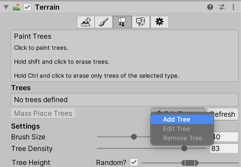 画面右のInspector内の「Terrain」から木のアイコン(Paint Trees)を選択し