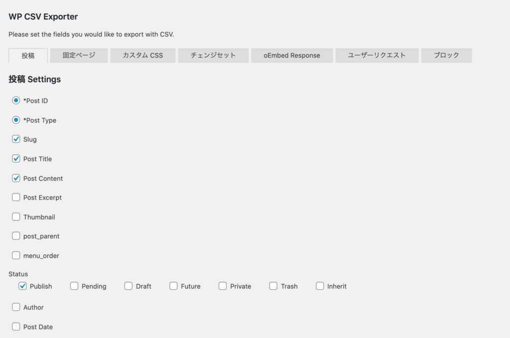 ここでは「投稿記事」をエクスポートすることにする